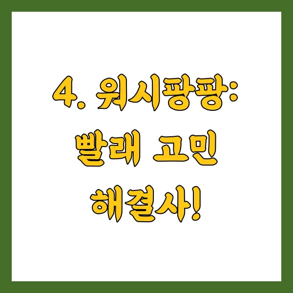 빨래가 귀찮고 어렵다면? 워시팡팡 셀프빨래방을 이용해보세요! 최신 세탁 장비와 건조기로 간편하게 빨래를 해결할 수 있습니다. 합리적인 가격에 깨끗하고 뽀송뽀송한 빨래를 경험할 수 있을 거예요!✨ 게다가 워시팡팡은 빨래방 창업을 꿈꾸는 분들을 위한 다양한 지원도 아끼지 않는답니다. 창업 컨설팅부터 사후 관리까지, 워시팡팡이 함께라면 성공 창업, 문제없어요!👍 전화(1588-4834) 또는 워시팡팡 공식 웹사이트를 통해 문의해보세요.📞